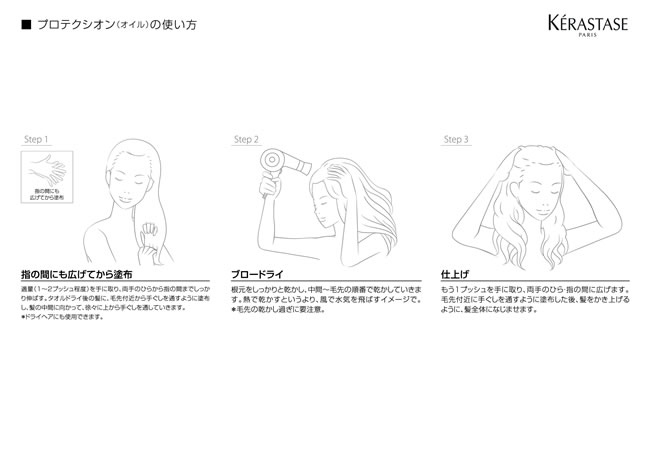 タオルドライ後の髪に、毛先付近から手ぐしを通すように塗布し、髪の中間に向かって徐々に上から手ぐしを通していきます。