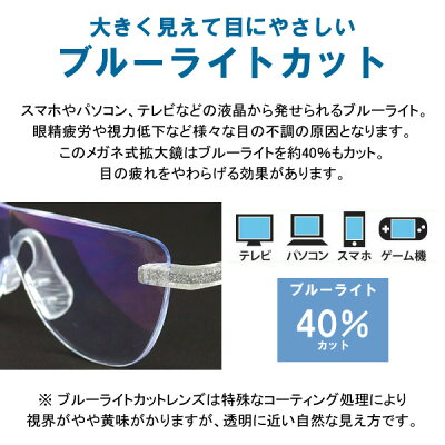 【仕様】拡大率1.6倍 ブルーライト40%カット 【素材】TR90(超弾力性プラスチック) 【サイズ】レンズ:縦(約)5cm×横(約)13.5cm 丁番含む横幅:15.5cm 鼻パット幅:(約)最大;2cm テンプル長さ:(約)15.3cm 重量:約38g 【付属品】 BOX