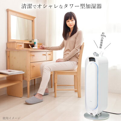 インテリア オシャレ 白 ホワイト <加湿量:約550ml/h> \ リビングにピッタリ /光るイルミネーションランプ!アロマも対応したオシャレな超音波加湿器 ●タワー型で高い位置から加湿し、広く潤いを与えます。